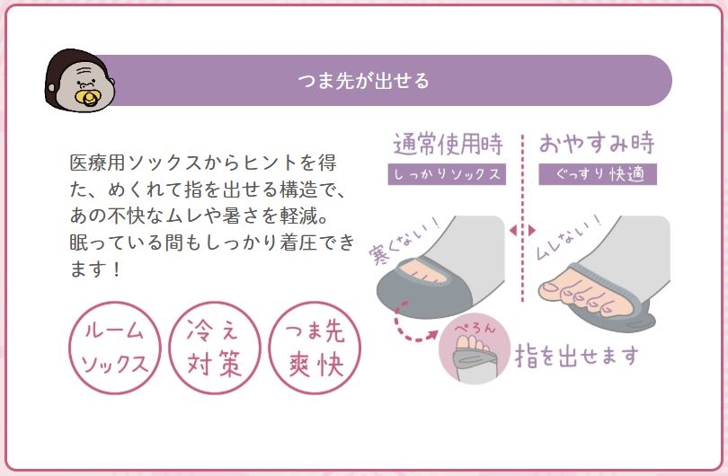 普段使いはもちろん、就寝時にはつま先を出して使えるのでムレずに快適!